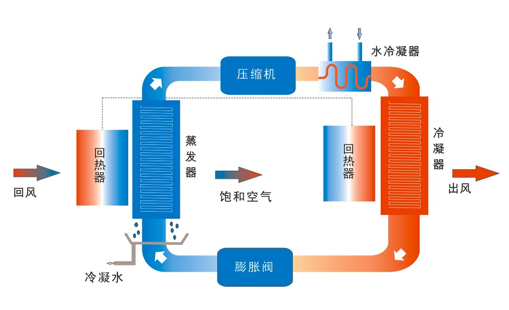 泳池除濕熱泵回?zé)嵫h(huán)是在除濕熱泵機(jī)內(nèi)增加回?zé)崞?,使進(jìn)入蒸發(fā)器的空氣溫度下降而進(jìn)去冷凝器的空氣溫度上升;回?zé)嵫h(huán)使蒸發(fā)器冷量用于空氣降溫減少(無效耗冷過程),而用于降溫除濕過程冷量增加,使熱泵干燥的最佳蒸發(fā)溫度及最佳除濕量上升;增加回?zé)嵫h(huán)的除濕熱泵是比普通泳池除濕熱泵是40%以上;