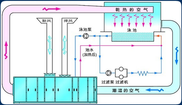 - 解決觀眾和泳池運(yùn)動(dòng)員對溫度要求不一致的難題;解決室內(nèi)潮濕含氯氣體對結(jié)構(gòu)腐蝕難題(空氣中的孢子能使控制質(zhì)量變壞,凝結(jié)后能使建筑物材料變質(zhì)) ,可延長建筑物的適用壽命;解決室內(nèi)玻璃結(jié)露(對玻璃窗吹干燥空氣避免玻璃結(jié)露)和天棚滴水的難題;泳池恒溫恒濕熱泵既干燥了空氣達(dá)到除濕的效果,還可以回收蒸發(fā)掉的水份至泳池,減少泳池補(bǔ)充水;