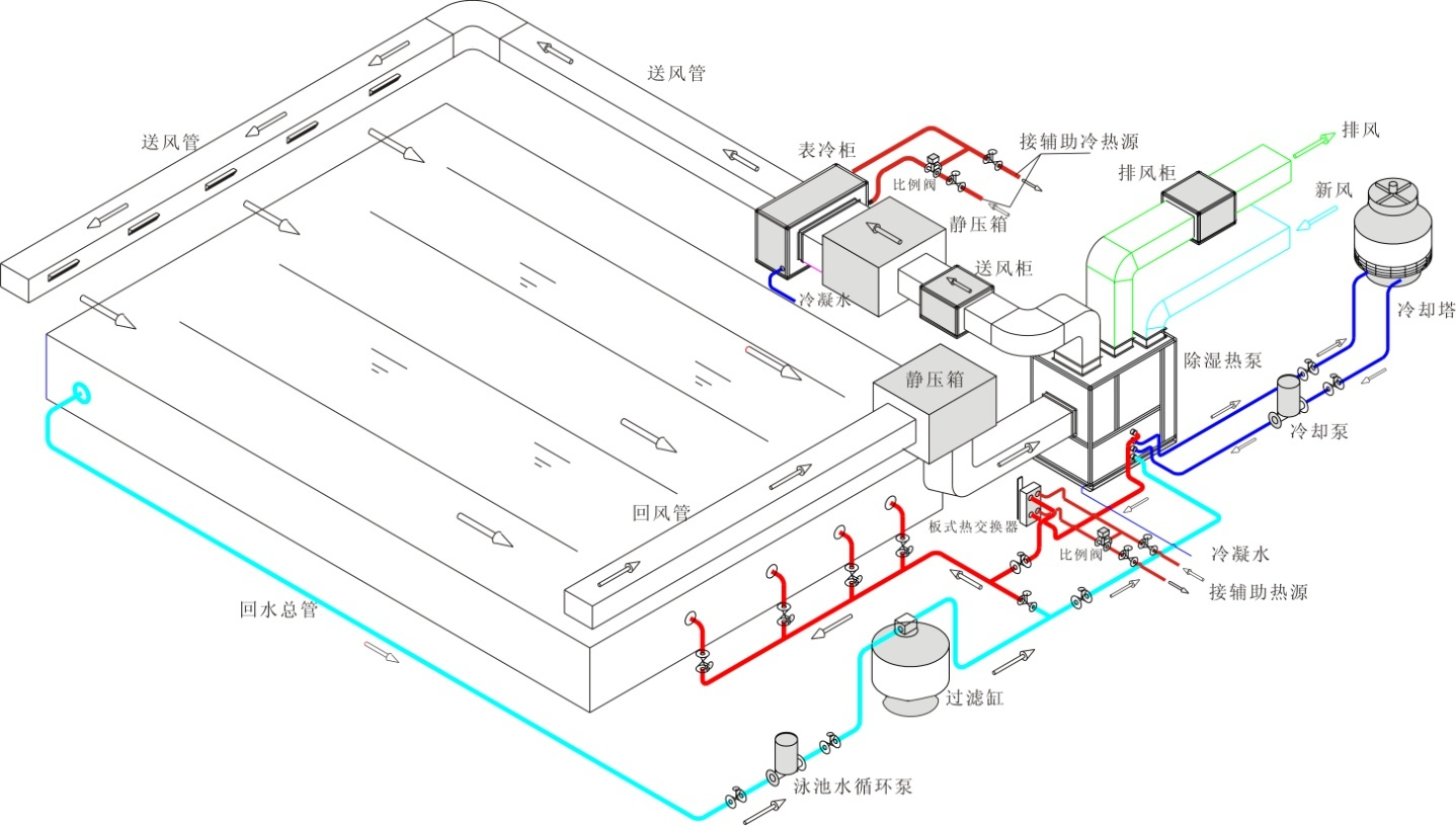 - 采用多元控制方式,充分保證室內(nèi)溫度、濕度及泳池水溫度的穩(wěn)定性;室內(nèi)溫度控制在26~30℃(可調(diào)),相對濕度50~75%及泳池水溫度26~42℃(可調(diào));